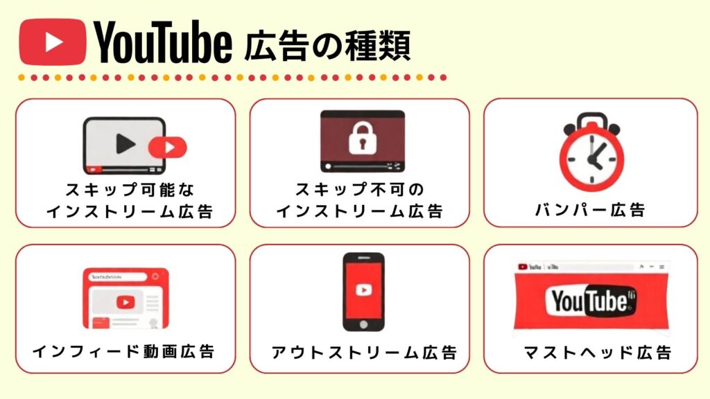 YouTube広告には、目的や予算に応じて選べる複数のフォーマットがあります。それぞれの特徴を理解し、適切に使い分けることが成功の鍵です。